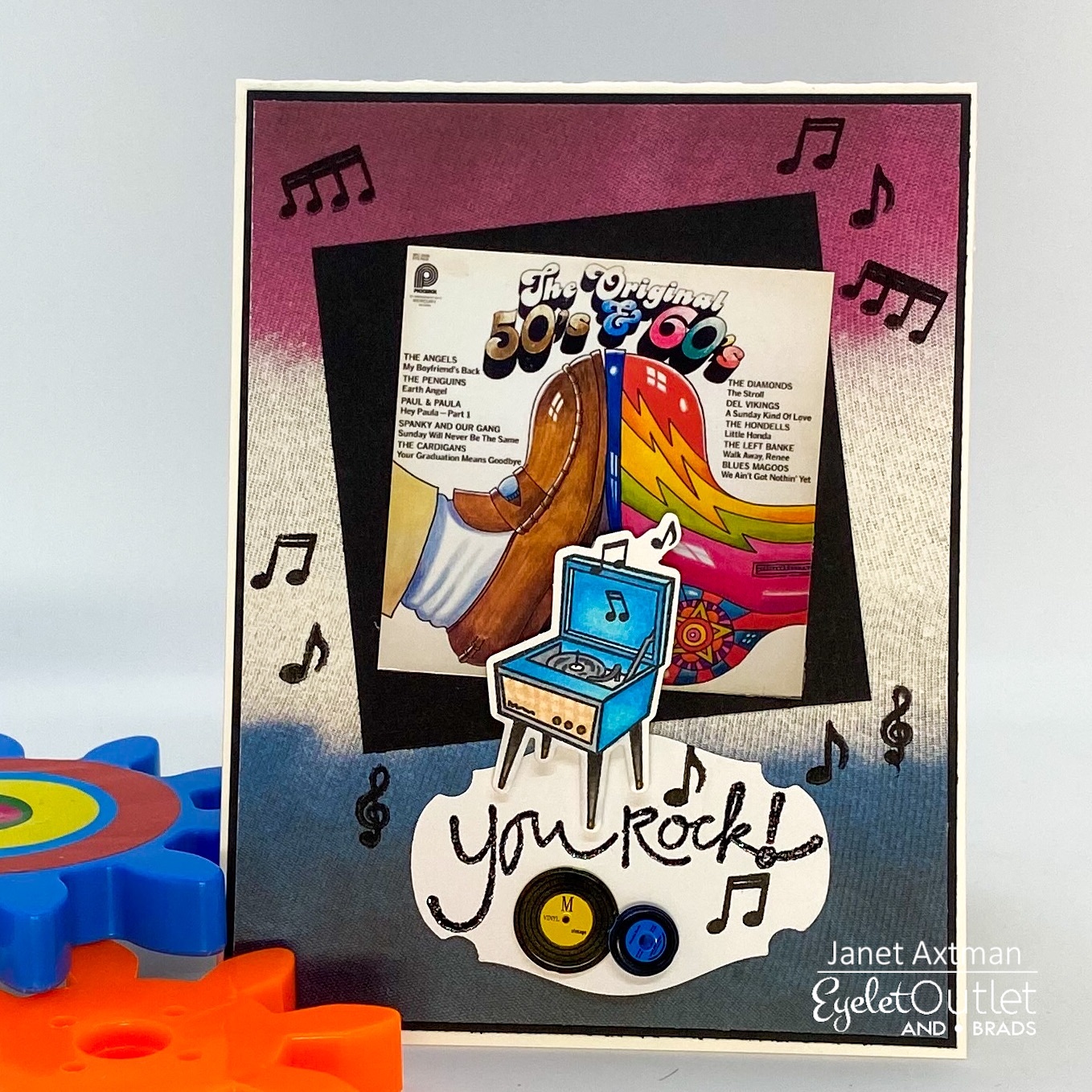 Here's another one paired with the Headphone brad from the Computer and Headphone Brad Set. Having the option of the large and small records really makes them easy to use both as focal points and in sentiments. I used thin strips of Skinny Black Glitter Washi Tape over a background image that was free on the internet. A few Silver Glitter Enamel Dots and a bow on top of the two stacked tags "round" this one out. Get it? Round? Albums? Ha, ha! Ok. It must be late because I think I'm the only one laughing! Until next time....